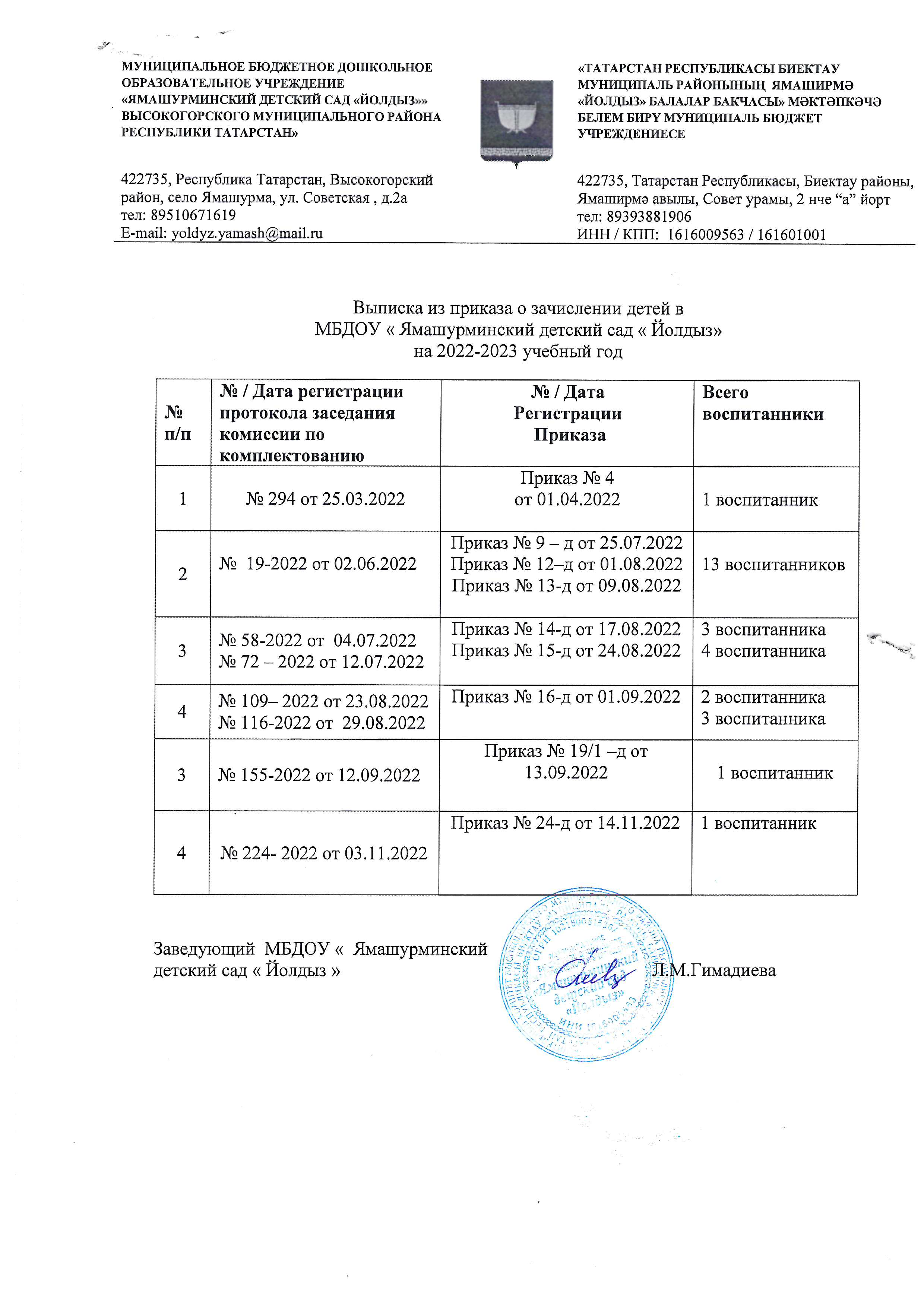 Выписка из приказа о зачислении детей на 2022 - 2023 учебный год