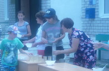 Балалар сабантуе вакытында дуслык боткасы һәм компот белән сыйлау