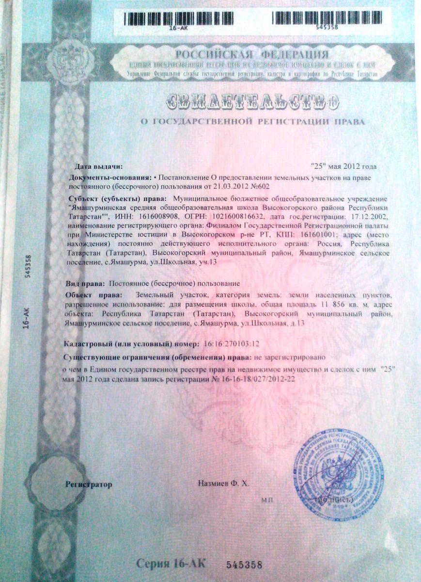 | Адрес: | 422735, г. РТ, Высокогорский район, с Ямашурма, ул. Школьная, д. 13 |