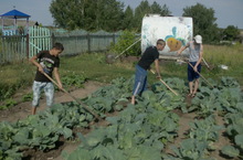 Дружно работают ребята на пришкольном участке.