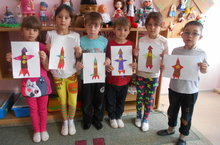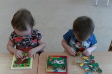 Малыши 1"в" младшей группы пробуют самостоятельно собирать из деревянных пазлов животных и героев из мультфильмов.