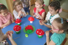 В МБДОУ «Верхнеуслонский детский сад «Берёзка» ручным трудом воспитатели Раиса Боброва и Ольга Гусева занимаются с детьми со второй половины учебного года. Старательно малыши вместе с воспитателем делают мухоморчики. Яркие мухоморы стали частью игры, и помогли в оформлении группы.