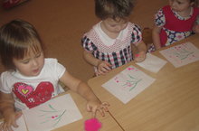 Для детей раннего возраста забавы с красками превращаются в волшебство. Воспитатель МБДОУ «Верхнеуслонский детский сад «Березка»» Елена Сакина в своей работе с детьми 1 «В» младшей группы использует методы арт-терапии (рисование пальчиками, бумагой, губками). Рисование пальчиками это целый ритуал. Незабываемые ощущения испытывают дети, когда опускают палец в гуашь — плотную, но мягкую, размешивают краску в баночке и переносят её на бумагу.