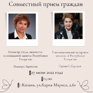 27 июня 2022 года в Аппарате Уполномоченного по правам человека в Республике Татарстан (г.Казань, ул.Карла Маркса, д.61) состоится совместный прием граждан Уполномоченным по правам человека в Республике Татарстан и министром труда, занятости и со иальной защиты Республики Татарстан. У жителей муниципальных районов республики будет возможность задать свои вопросы посредством прямого подключения через программу «Skype» в приемных Общественных помощников Уполномоченного по правам человека в муниципальных образованиях республики. Жителям республики, желающим обратиться к Сарие Сабурской и Эльмире Зариповой необходимо заранее записаться по телефону (843) 236-41-80 и к назначенному времени прийти в приемную Общественного помощника Уполномоченного либо в Аппарат Уполномоченного по правам человека в Республике Татарстан.