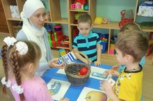 Духовное богатство народа- это родной язык. Воспитание патриотических чувств и уважения к родному краю формируется через знакомства и изучения родных языков. Ребята средней группы в этом году в режимных моментах начали изучать татарский язык. Педагог по татарскому языку Алия Минвалеевна в игровой форме знакомит детей с азами татарского языка. Особое значение уделяется формированию правильного звукопроизношения и усвоению элементарной лексики языка и обучению основам построения фразы. Основной задачей изучения татарского языка является вовлечение детей в интереснейший процесс знакомства с другим языком и культурой. Дети с большим удовольствием играют в разные игры «Магазин», «Телефонный разговор», «Семья», запоминая при этом новые слова, тем самым приобщаясь к культуре татарского народа.