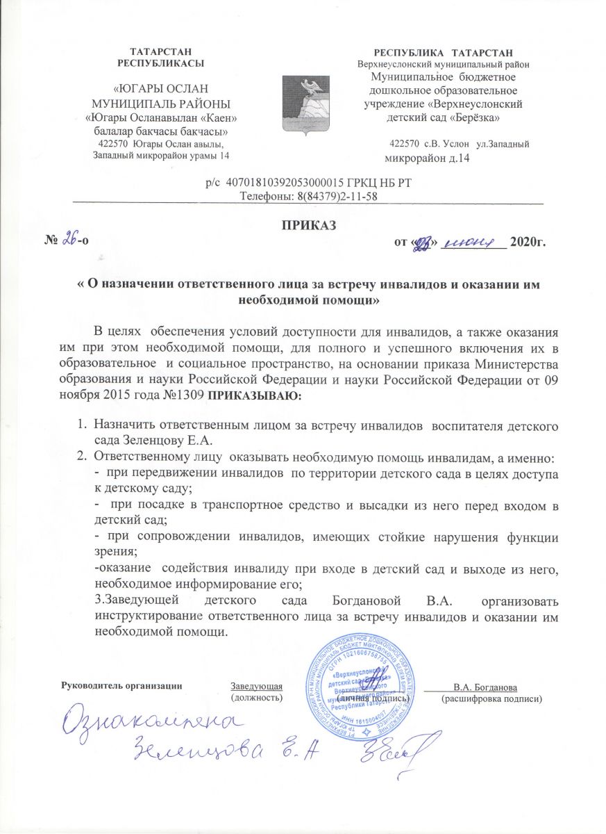 Приказ о назначении ответственного лица за встречу инвалидов и оказание им необходимой помощи