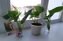 В Зелёном уголке 6 класса начался эксперимент. Опытным путём мы определим в каком случае отростки комнатного растения антуриума лучше приживаются: в воде, в воде со стимулятором корнеобразования или посаженный сразу в почву. Ждите итогов эксперимента через месяц.