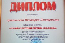 Подведены итоги республиканского культурно-образовательного проекта «Культурный дневник школьника». Это значимый проект Татарстана, реализуемый Министерством культуры РТ, Министерством образования и науки РТ под патронажем Президента Республики Татарстан Рустама Минниханова. По итогам конкурса по печатному "Культурному дневнику школьника" в 2019-2020 учебном году в Республике Татарстан определено 216 победителей в номинации «Лучший культурный дневник школьника» . Среди победителей ученица 3 А класса МБОУ "Верхнеуслонская гимназия" Артемьева Виктория! (классный руководитель: Куклихина Татьяна Сергеевна) Виктория награждена Дипломом Победителя и ценным памятным подарком! Пожелаем успехов Виктории и ее педагогу!!!! Участвуйте и побеждайте!