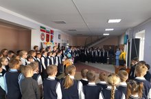 После классного часа на линейке 9 класс отчитался о дежурстве и передал его 8 классу, также были вручены грамоты за участие в конкурсах и мероприятиях прошедшей недели. Честь поднять флаги сегодня выпала нашим отличникам – Корневу Арсению и Барановой Милане.