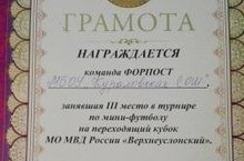 Сегодня,4 декабря, в спорткомплексе «Чемпион» состоялся VI турнир по мини-футболу на переходящий кубок МО МВД РФ «Верхнеуслонский» среди молодежных формирований по охране общественного порядка «Форпост». В упорной борьбе учащиеся МБОУ «Кураловская СОШ» заняли призовое III место. Мы поздравляем нашу команду и желаем успехов в дальнейших соревнованиях.
