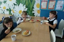 С 1 сентября 2020-2021 учебного года в столовой школы организованы бесплатные обеды. Обед состоит из трех блюд: первое, второе и третье. Сегодня повара приготовили суп вермишелевый с курицей, овощное рагу, свежие помидоры и компот из свежих яблок. Для приготовления обедов используются овощи и фрукты, выращенные на пришкольном участке.