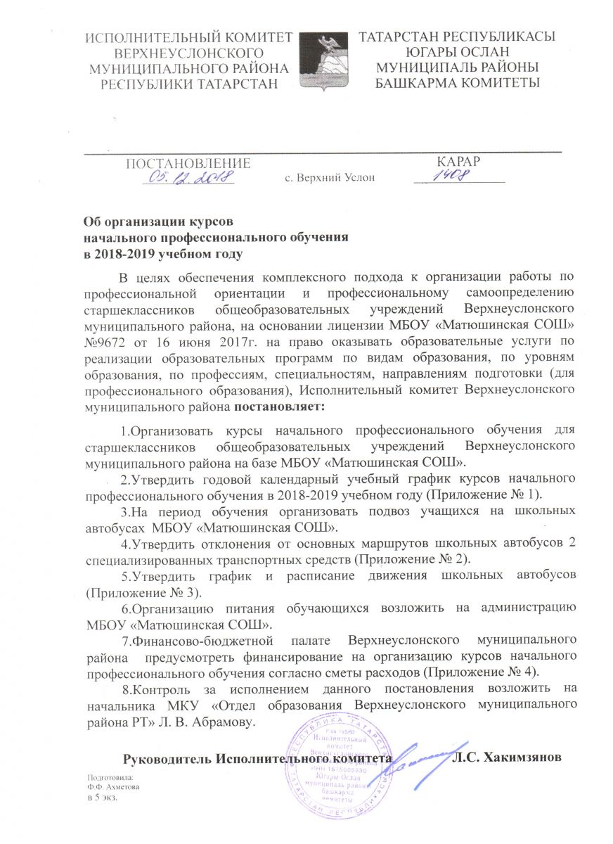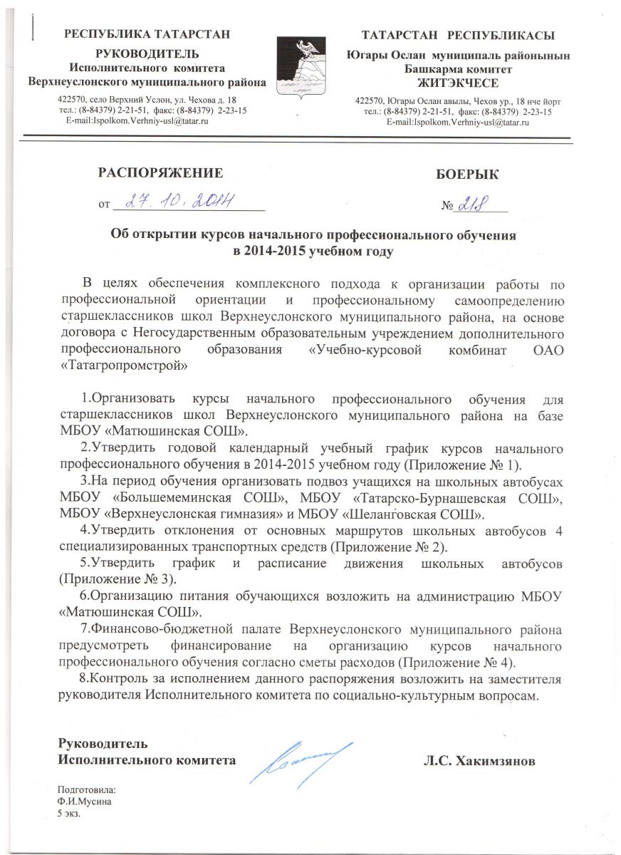 Распоряжение об открытии курсов начального профессиональноно обучения