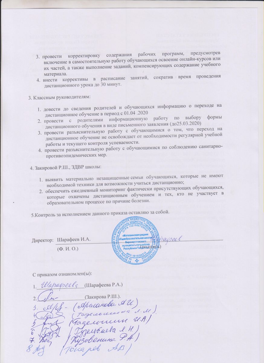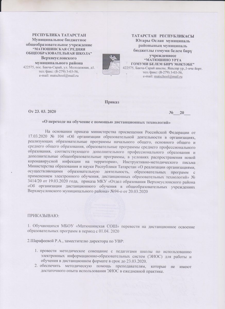 На основании приказа министерства просвещения Российской Федерации от 17.03.2020 № 104 «Об организации образовательной деятельности в организациях, реализующих образовательные программы начального общего, основного общего и среднего общего образования, образовательные программы среднего профессионального образования, соответствующего дополнительного профессионального образования и дополнительные общеобразовательные программы, в условиях распространения новой коронавирусной инфекции на территории», Инструктивно-методического письма Министерства образования и науки Республики Татарстан «О реализации организациями, осуществляющими образовательную деятельность, образовательных программ с применением электронного обучения, дистанционных образовательных технологий» № 3414/20 от 19.03.2020 года, приказа МКУ «Отдел образования Верхнеуслонского района «Об организации дистанционного обучения в общеобразовательных учреждениях Верхнеуслонского муниципального района» №94-о от 20.03.2020 и приказа МБОУ «Матюшинская СОШ» «О переходе на обучение с помощью дистанционных технологий №20 от 23.03.2020 года.