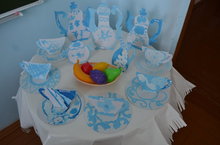 На дворе уже тепло, но занятия еще не закончились и воспитанники старшей группы вооружились кистями и красками и сотворили чудесную посуду из картона. Голубой - цвет летнего неба! Каждый из ребят очень старался и украшал свою посуду с усердием!