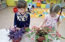 В рамках экологического воспитания детей ребята из старшей группы ухаживают за комнатными растениями в своей игровой.