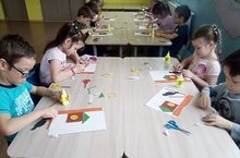 Воспитанники старшей группы на занятии вырезали из бумаги и клеили аппликацию "Скворечники".