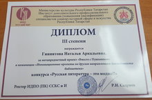 В конкурсе «Русская литература – это модно?!» на лучший информационно-методический материал с описанием инновационного опыта продвижения чтения классической и современной русской литературы, организованный Институтом дополнительного профессионального образования специалистов социокультурной сферы Республики Татарстан приняла участие учитель русского языка и литературы МБОУ «Набережно – Морквашская СОШ» Гиниятова Н. А. За метапредметный проект «Вместе с Пушкиным» Наталья Аркадьевна была награждена Дипломом 3 степени Министерства культуры Республики Татарстан.