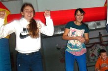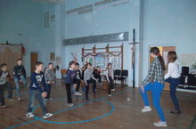 Дәртле музыка ритымнарына вожатыйлар һәм аларның тәрбияләнүчеләре бию хәрәкәтләрен ясыйлар.