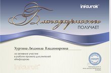 Преподаватель теоретических дисциплин, подготовивший ребят, Л.В. Хуртина получила Благодарность за участие в работе проекта для учителей «Инфорурок».