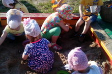 Один из самых увлекательных игр - это игры в песочнице. В играх с песком проявляется естественная активность ребёнка. Песок является прекрасным психопрофилактическим средством. Песок буквально завораживает детей. Во время дневной прогулки у воспитанников группы «Любознайки» любимое время провождения около песочницы. Для каждого малыша в доступности выносные игрушки. Некоторые дети учатся конструировать небольшие постройки. Большинство малышей с большим интересом с помощью формочек лепят из песка разные фигурки. Таким образом, во время игры с песком воспитанники приобретают навыки обыгрывания своих построек и учатся общаться дружелюбно со сверстниками.