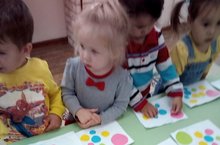 Воспитатель рассказал детям о форме, размерах мяча, объяснил, как кружочки разных размеров и цветов расположить на листе бумаги в порядке уменьшения, показал готовый образец приклеенных кружков на листе бумаги в порядке уменьшения. Затем провели физкультминутку «Медвежата».
