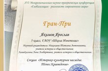 Поздравляем Якимова Ярослава, ученика 5 класса и его наставника Хамидуллину Л.А., учителя истории и обществознания, с Гран-При на XVI Межрегиональной научно-практической конференции "Глобализация - реальность современного мира" в секции "Историко-культурное наследие. Топос. Краеведение"!