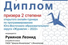 Поздравляем Румянова Леонида, Жигулина Ивана из 8 класса с призовыми местами на Открытом онлайн-турнире по программированию Юго-Восточного образовательного округа «Журавлик – 2022»!