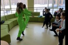 На переменах ребятам предлагалось вместе с учителями принять участие в динамических паузах, которые проводили для них мультяшные герои с экранов мониторов. -
