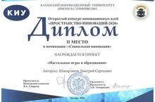 22-23 октября в Казанском инновационном университете имени В. Г. Тимирясова прошел III Международный инновационно-образовательный кампус «Научно-производственный бизнес: стратегии будущего в условиях цифровой трансформации», объединивший более 250 участников из различных регионов России и зарубежья. В этом году было предоставлено более 100 проектов по 6 номинациям. Школу Иннополис в конкурсе проектов представлял учитель географии Шакирзянов Дмитрий Сергеевич с проектом «Настольные игры в образовании».