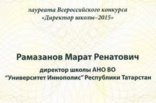 Всю последнюю неделю ноября Марат Ренатович Рамазанов сражался за победу в г. Москва на Всероссийском конкурсе «Директор школы-2015».Наш директор с достоинством прошел все испытания и вернулся из столицы с дипломом лауреата Всероссийского конкурса «Директор школы - 2015» и дипломом победителя в номинации «Директор-новатор».