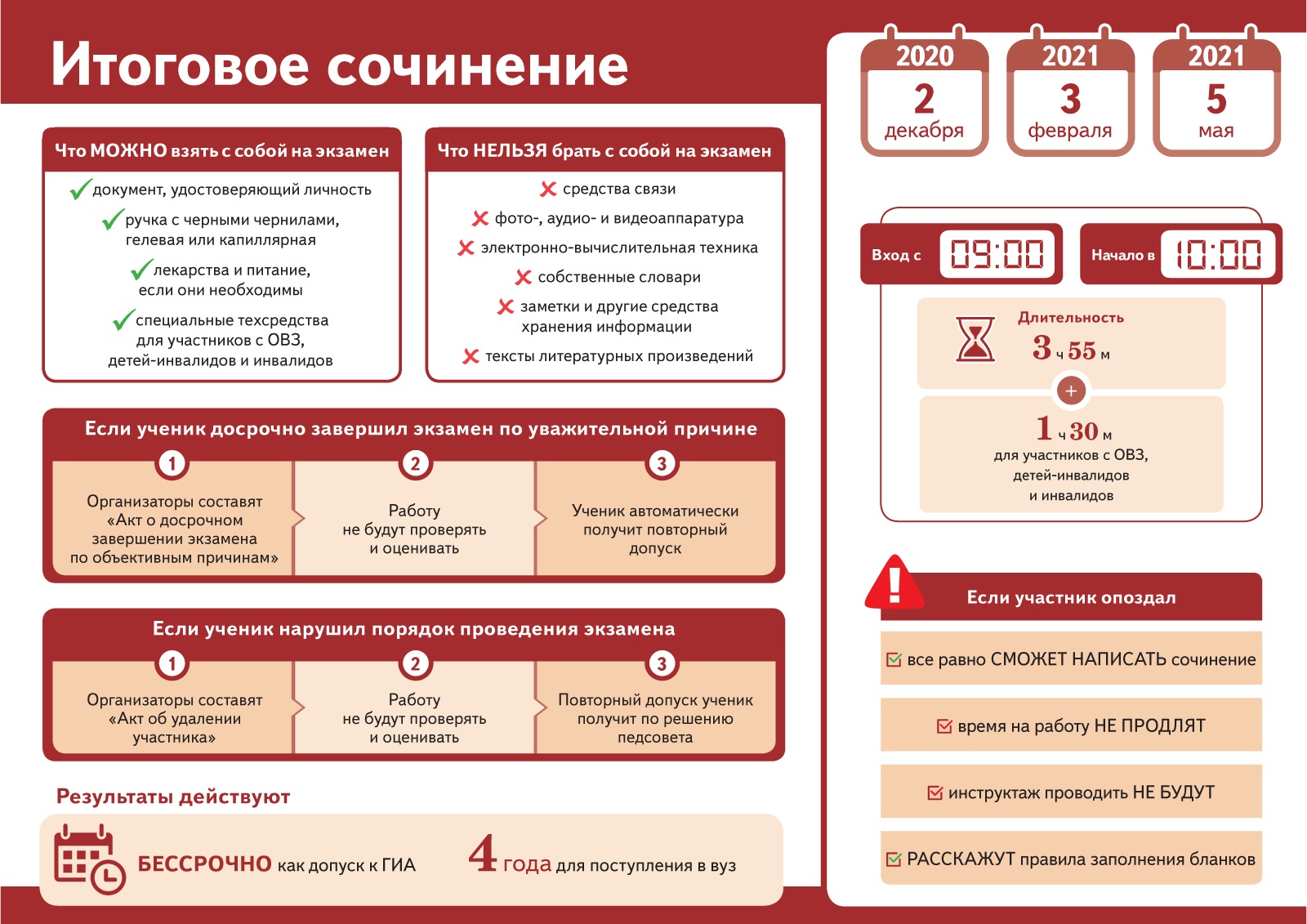 Внимание! В соответствии с приказом Министерства Просвещения РФ и Федеральной службы надзора в сфере образования №665/1156 от 24 ноября 2020 года "Об особенностях проведения государственной итоговой аттестации по образовательным программам среднего общего образования в 2020/21 учебном году в части проведения итогового сочинения (изложения)" итоговое сочинение (изложение) для участников ГИА проводится 5 апреля 2021 г. по темам (текстам), сформированным по часовым поясам Федеральной службой по надзору в сфере образования и науки, лица, указанные в пункте 29 Порядка, повторно допускаются к написанию итогового сочинения (изложения) 21 апреля и 5 мая 2021 года.