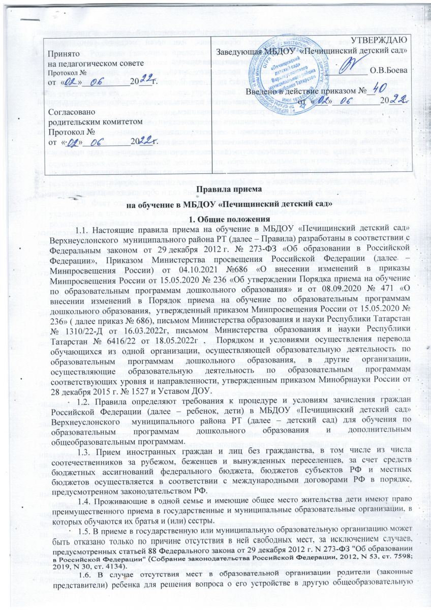 Правила приема на обучение в МБДОУ "Печищинский детский сад"