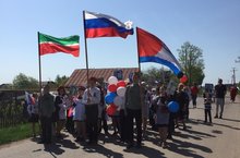 Җиңү көненә багышланган митинг Мәдәният йорты каршысында узды, анда мәктәп укучылары катнашты.
