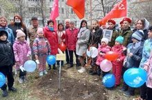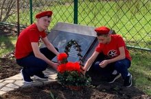 Все гости украсили берёзку георгиевскими ленточками, а к мемориальной плите возложили живые гвоздики.