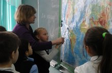 В рамках преемтсвеннности между начальным и средним звеном обучения, Ревуцкая Л.М., учитель географии, провела занятие по подготовке учащихся 4б класса к Всероссийским проверочным работам по окружающемку миру. Ребята работали с картой полушарий.