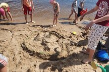 Летний день в пришкольном оздоровительном лагере "Солнышко", что находится на базе Верхнеуслонской школы, ознаменовался защитой проектов "Песчаный замок". Каждый отряд должен был построить замок из песка и, кроме того, рассказать о нем. Ребята 2 отряда представили на суд жюри феодальный замок, окруженный рвом. Рядом - огромный апельсиновый сад и избы крестьян. Третий отряд построил огромный средневековый замок, с башнями, откидным мостом и запасными подземными путями. Так же были такие творения, как Черепаший замок, Летающий замок и Парк развлечений в виде морской звезды. Фантазии не было предела! После защиты проектов ребят ждал сюрприз - надо было найти клад, зарытый в песке! Время пролетело быстро, счастливые и уставшие, ребята вернулись в школу.