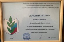 Почётной грамотой Территориальной организации профессионального союза работников народного образования и науки Российской Федерации Верхнеуслонского района Республики Татарстан был награждён директор МБОУ «Татарско-Бурнашевская СОШ» Бочков С. М. за добросовестный труд, высокий уровень профессионализма и активный вклад в развитие социального партнёрства.