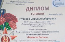 Спешим поздравить ученицу 8 класса МБОУ «Татарско-Бурнашевская СОШ» Нурееву Софью с победой во Всероссийском творческом детском конкурсе, посвященном 23 февраля, «Гордость России».