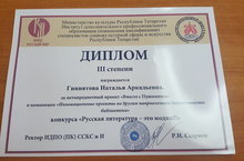 За метапредметный проект «Вместе с Пушкиным» Наталья Аркадьевна была награждена Дипломом 3 степени Министерства культуры Республики Татарстан.