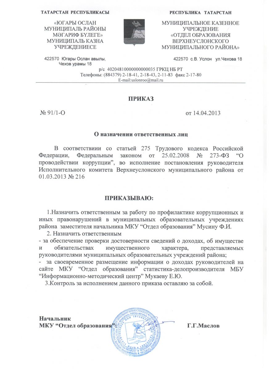 Приказ МКУ "Отдел образования Верхнеуслонского муниципального района" №91/1-О от 14.04.2013 г.