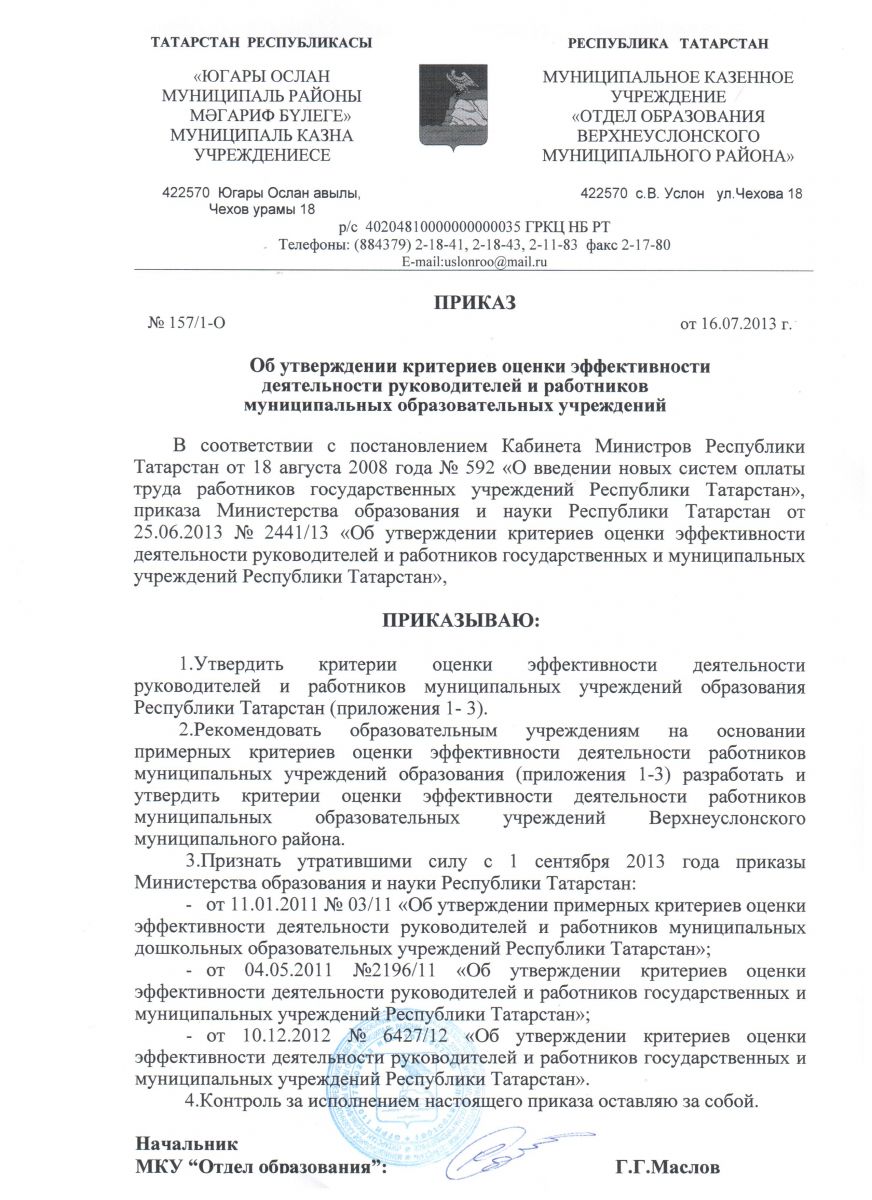 Приказ МКУ "Отдел образования Верхнеуслонского муниципального района" № 157/1-О от 16.07.2013 г. "Об утверждении критериев оценки эффективности деятельности руководителей и работников муниципальных образовательных учреждений"
