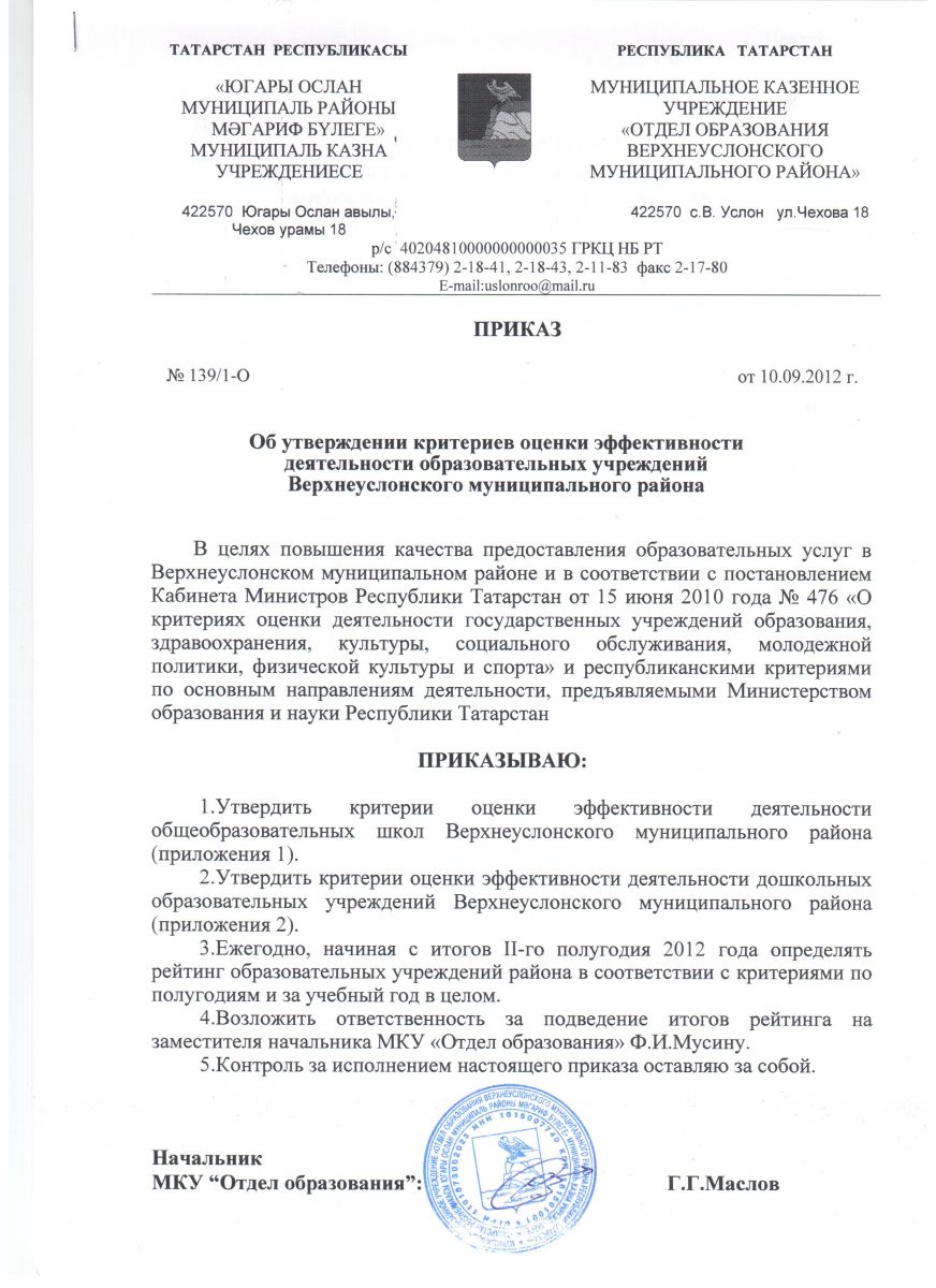 Приказ МКУ "Отдел образования Верхнеуслонского муниципального района" №139/1-О от 10.09.2012 г."Об утверждении критериев оценки эффективности деятельности образовательных учреждений Верхнеуслонского района"