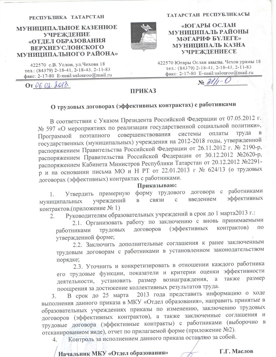 Приказ МКУ "Отдел образования Верхнеуслонского муниципального района" № 31/1-О от 06.02.2013 г. "О трудовых договорах (эффективных контрактах) с работниками"