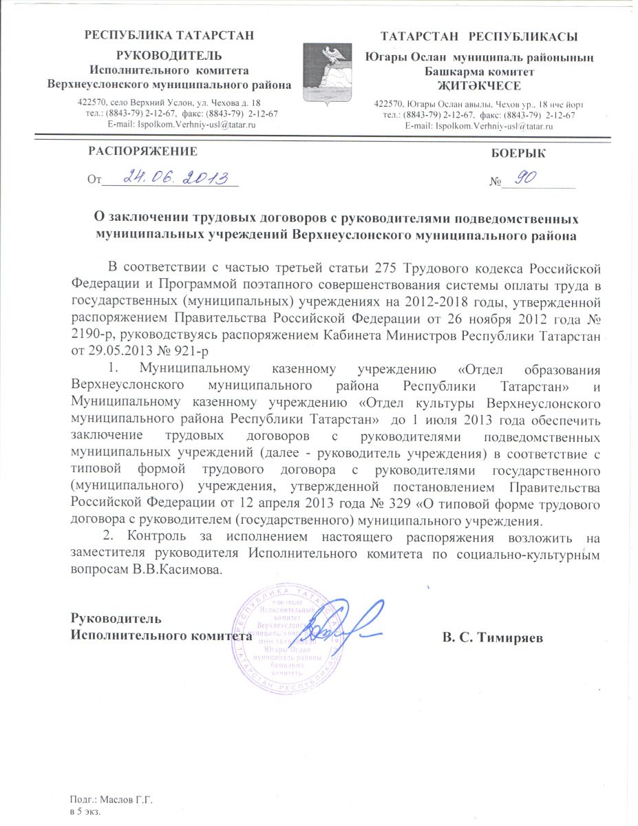 Распоряжение Руководителя Исполнительного комитетат Верхнеуслонского муниципального района № 90 от 24.06.2013 г. "О заключении трудовых договоров с руководителями подведомственных муниципальных учреждений Верхнеуслонского муниципального района