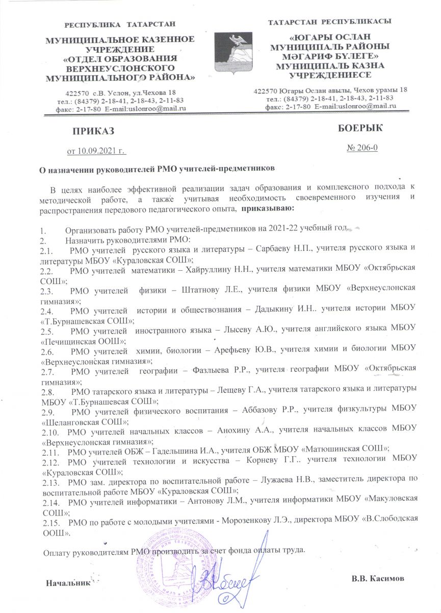 Приказ МКУ ОО №206-о от 10.09.2021 г. О назначении руководителей РМО