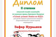 Подведены итоги онлайн-олимпиады "Самый лучший знайка по ПДД", среди воспитанников подготовительных групп. Воспитанники Введенско-Слободского детского сада Нуралив Зафар и Денисова Ирина получили дипломы второй и третьей степени.