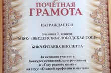 за активное участие в конкурсе сочинений, приуроченных Дню родных языков награждена Бикчентаева Виолетта, учащаяся школы