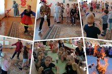 Как положено на празднике ,дети от души веселились: водили хоровод вокруг Масленицы, пели русскую народную песню «Блины», частушки, играли в игры и угощались блинами. Весь праздник ребят развлекали развеселые скоморохи. Веселые конкурсы не давали скучать никому!