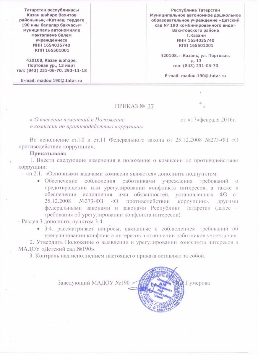 Приказ о внесении изменений в Положение об антикорупционной комиссии