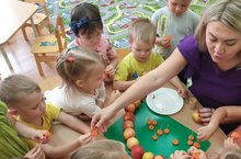 Младший возраст – самое благоприятное время для накопления представлений об окружающем мире. Внимание детей привлекают сезонные изменения в природе, яркость красок, многообразие звуков и запахов. Они открывают для себя новый мир: стараются все потрогать руками, рассмотреть , понюхать если возможно, попробовать на вкус. Ребята первой группы возраста с удовольствием разглядывали щедрые дары Осени.